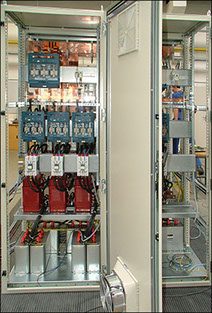 - Bezkontaktní chráněná kompenzace se spínáním baterií pomocí polovodičových spínačů spínajících v nule a používá se v sítích zatížených velkými pulsními odběry (svářecí automaty, lisy, atd.)
